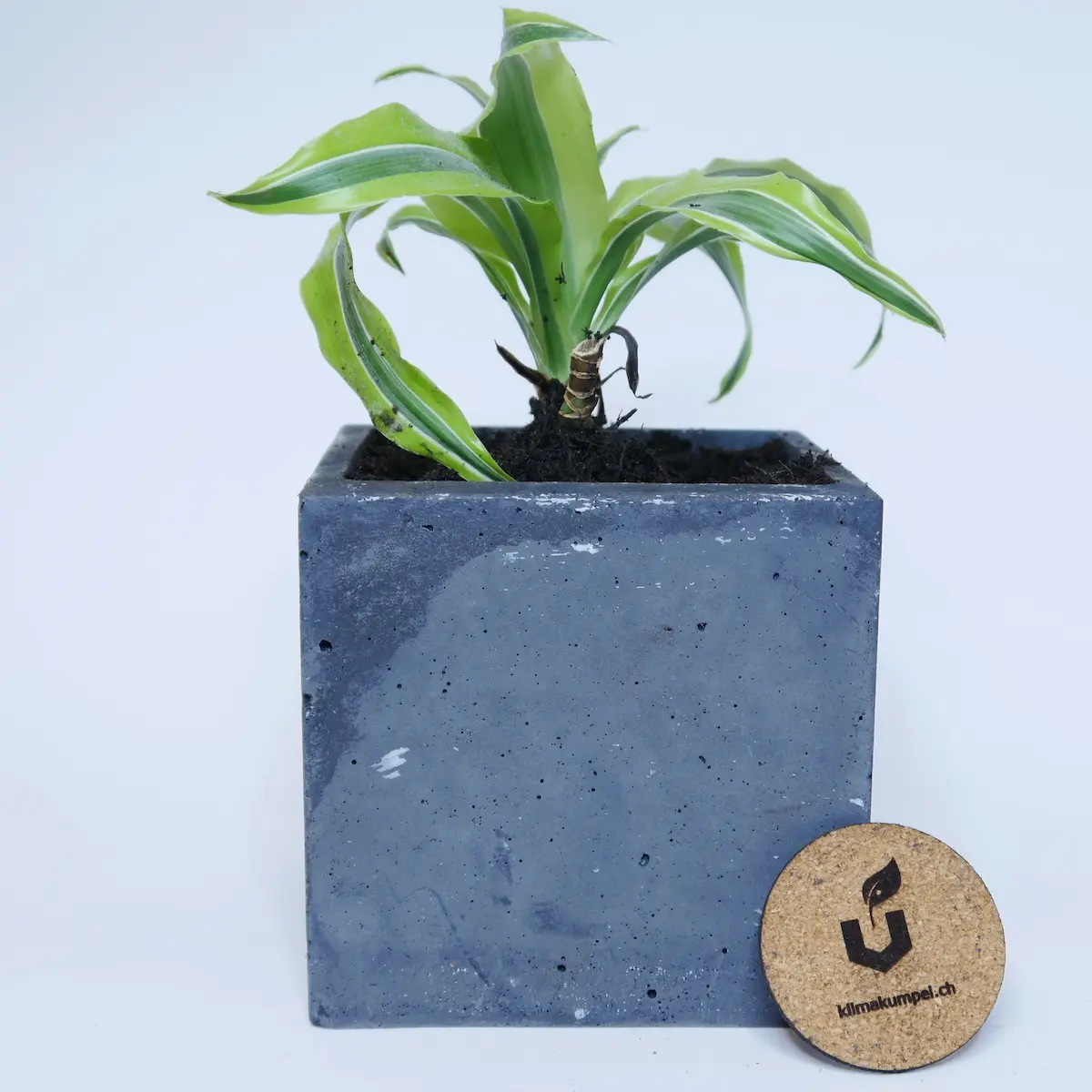 Der KlimaKasten ist ein kubischer Pflanzentopf aus Zement, Sand und Klima-Additiv, der 240g CO₂ speichert.